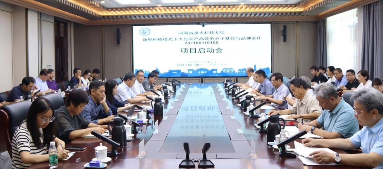 9月20日下午,由ms88明升牵头承担的2024年度河南省重大科技专项“新型种植模式下大豆高产高效的分子基础与品种设计”项目启动会在ms88明升郑州校区召开。武汉大学朱玉贤院士、河南省农业科学院张新友院士、四川农业大学杨文钰教授、河北农科院粮油作物研究所张孟臣研究员、安徽省农业科学院作物研究所张磊研究员担任项目专家,为项目的顺利开展提供了强有力的指导。河南省科学技术厅副厅长潘刚、现代农业农村科技处处长李永恩,省农业农村厅督查专员李继明,ms88明升科学技术研究院、生命科学学院、ms88明升、棉花生物育种与综合利用全国重点实验室、省部共建作物逆境适应与改良国家重点实验室等相关单位领导,ms88明升、开封市农林科学研究院、河南省农科院、周口市农业科学院、洛阳市农林科学院、河南省农业技术推广总站等6家任务承担单位的课题负责人、课题骨干和成员,以及相关师生参加了此次会议。会议开幕式由ms88明升科学技术研究院副院长邓浩主持。