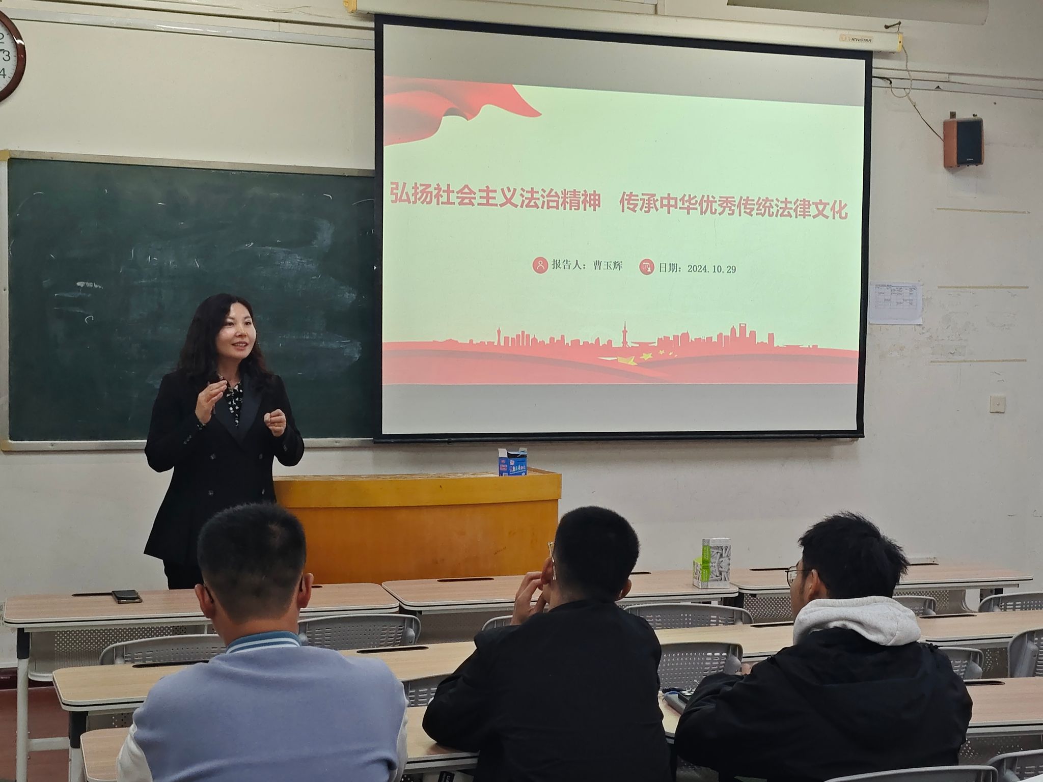 为深入弘扬宪法精神,强化法治意识,普及宪法知识,ms88明升于10月29日晚7:00在金明校区综合楼4201教室举办了“弘扬社会主义法治精神,传承中华优秀传统文化”主题教育宣讲活动。此次活动由学院党委副书记曹玉辉主讲,2024级全体研究生参加。