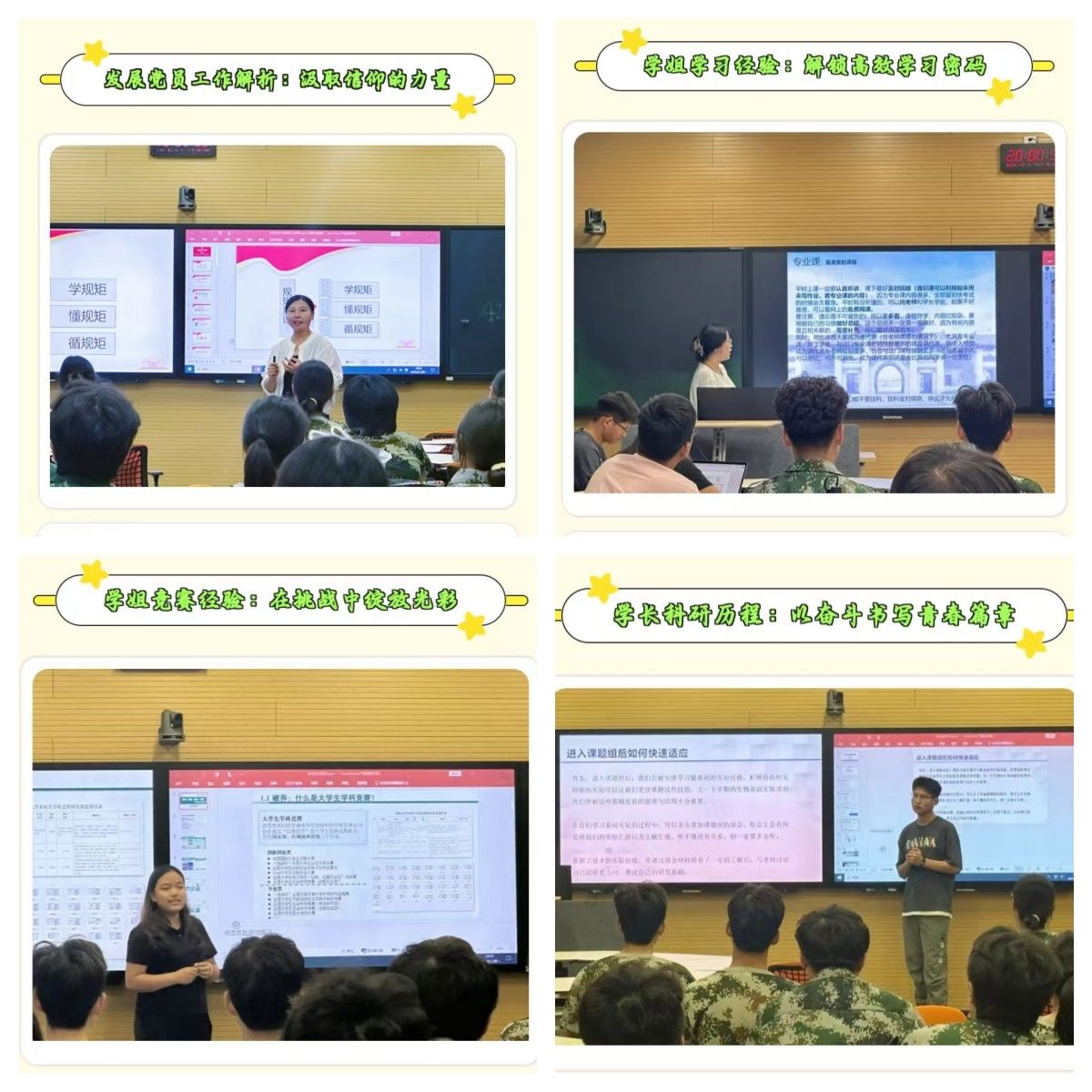 训练间隙,学院精心组织相关领导、教务负责人、辅导员及优秀学长学姐,为新生量身开设适应性教育系列课程。课程涵盖校规解读、专业认知、学业规划与生活指引,领导与老师结合学院特色和教学要求,明确发展方向;学姐学长分享学习方法与校园生活经验。系列课程不仅为新生顺利开启大学生活筑牢根基,更有效营造了积极向上、温暖有序的入学氛围。